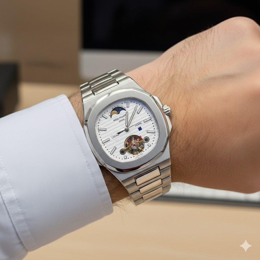 - تصميم Nautilus الأسطوري: إطار ثماني أضلاع فريد من نوعه يجمع بين الأناقة الرياضية والهيبة.